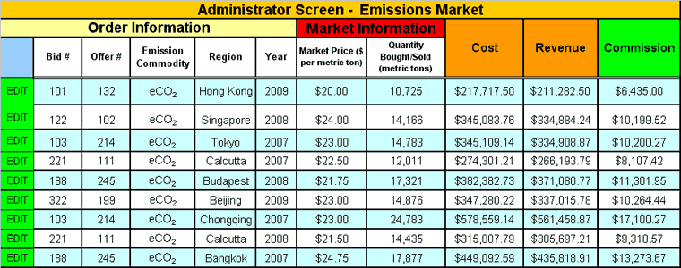 The performance of any market, as defined in terms of liquidity, price volatility, and trading volume must always be monitored in order to ensure its efficient operation. Siena has substantial experience in developing software that enables market administrators to monitor the operations of the market. The screen below is an example of software that we developed that allows the administrator of a market to monitor the performance of market for the trading of emissions credits.